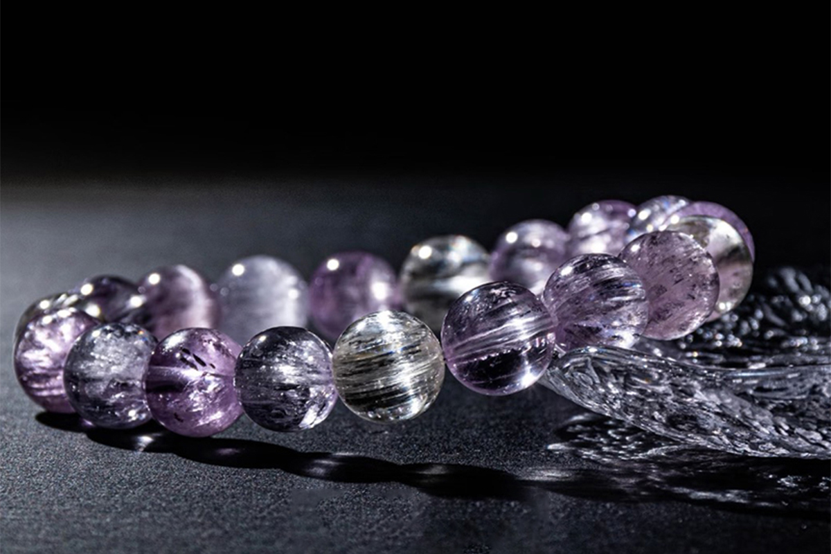 髮晶(髮絲水晶):內含針狀礦物(金紅石等),金髮晶主強力招財、權威、能量
